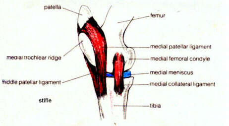 Upward fixation of the Patella: Also referred to as an uncontrollable locking of the stifle. The hind limb is locked in extention and the hock can not be flexed. This can start intermittently during forward motion. This can also progress to the point of the joint being stuck and a horse hopping on 3 legs. In some cases backing or a jump forward can release the sticking of the joint. The legs can move somewhat uncoordinated and jerky in their movement. One or both stifles can be affected. In palpation when the stifle is in a fixated state one can feel the ligaments being tense and ridged.